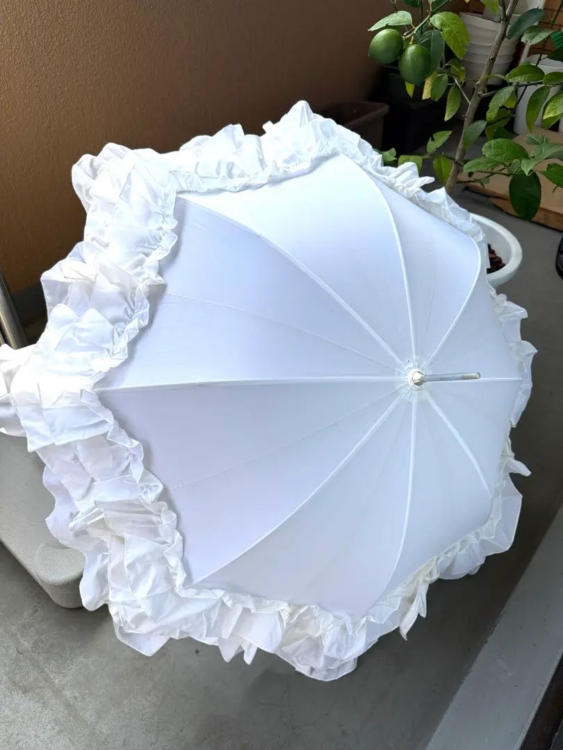 This is a cute parasol with frills. It hasn't been used much, but there are a few minor stains. I think it's perfect for cosplay, etc. Length: 82 cm Width of the open umbrella: 88 cm